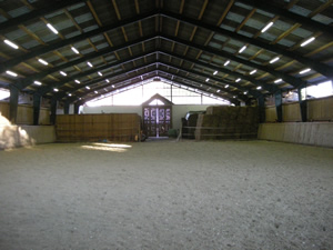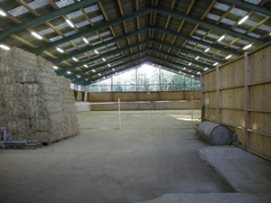 Die Halle ist ein landwirtschaftliches Mehrzweckgebäude. Sie wird für die Futtereinlagerung und als Abstellplatz für Maschinen verwendet. Ein Teil steht den Pferden als Ruheraum zur Verfügung. Der hintere Abschnitt wird für die Bewegung und Ausbildung der Pferde genutzt. |